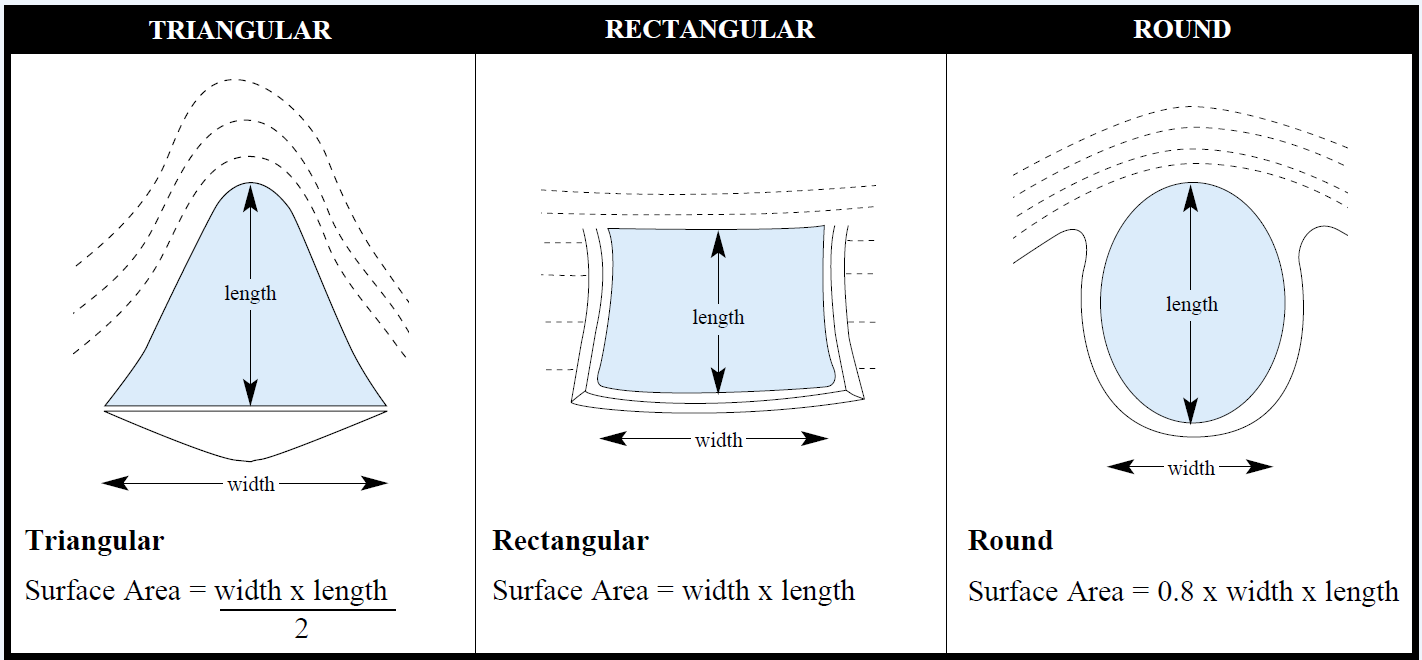 - Use the formula relevant to the dam shape above to calculate surface area in square metres of each dam and record the results.